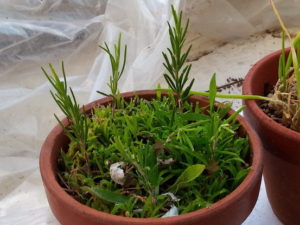 左: 物干しのローズマリーは25日に挿し木したばかり。活着して呉れるかな。今日は活性希釈液を上げてみよう。葉が新しく展開するまでは毎日水遣りが必要です。今日は暑い時は屋内の日陰に取り込んで置きましょう。