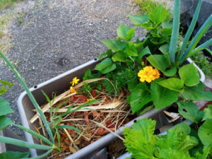 玄関前のサツマイモには、ビオラの時に植えられたマリゴールドが残っています。ビオラと一緒にある時は余り調子が良く無さそうでしたが、サツマイモの葉が覆いかぶさって来るのに元気です。同じ夏の植物同士のコンパニオンなのかしらね。