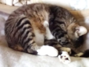2019年11月17日の日曜日にうめが我が家にやって来て、10日して既に福と一緒に居るうめの写真があった。トラ子はこういう時に仔猫に興味を示さないが、福は違う。舐めたり、寄り添ったりして、近寄って行く。これが、うめに初めての発情で追いかけられる事になるのだが(ない。
