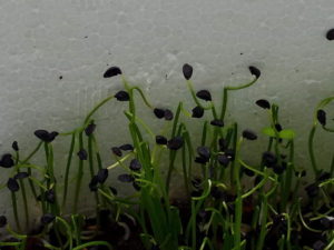 物干しの葱苗です。一日で随分延びました。今日は雨が時々パラパラと来るだけだから、蓋は取りっぱなしです。