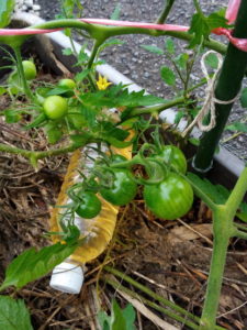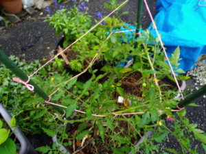 玄関アプローチのトマトにはいよいよ支柱ヒモを懸けました。紐に枝を絡ませながら進んで行きます。