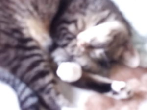 トラ子は急速に入り、福も物干しで休んでいます。うめが4時30分過ぎに帰って来て食事中です。うめの余りはホンの一口でしたが、持って行くと福が物干しでアマガエルと遊んでいました。