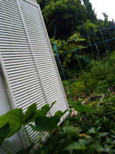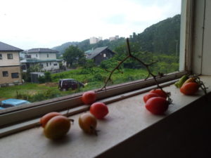 玄米を洗う前に、玄関前の写真を少し取りました。雨上がりで生まれたてのやぶ蚊の赤ちゃんが猛烈な勢いで迫って来ます。『愛の献血を~!』冗談じゃないてぇ~のッ!。何だかがむしゃらに向かって来てチクン!と痛いのよね。庭仕事には蚊取り線香が必携です。庭のトマトも面倒見なくっちゃね。