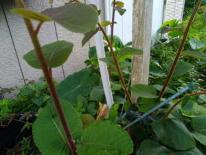 左: 此方は元々の里芋畝です。中: またキウイが伸び出しました。鋸を当てないと却って可哀想かな。