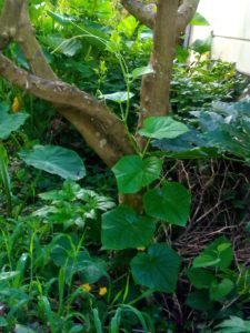 今年は春の播種の出だしが遅かったので、南瓜の根が回り、葉が展開し、花が咲くのも動き始めるのも遅かったのですが、梅雨明けと同時に驚くほどの動きを急に見せ始め、木に登っています。これぞ、南瓜の本骨頂です。