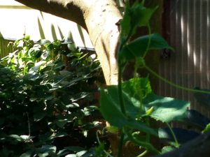 夏蜜柑に上って行く胡瓜を見に行って来ました。わぁ、気が付かない実が、それもかなり大きい!嬉しいなぁ、頑張れ。