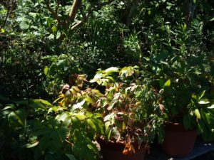 中: 芍薬の葉が枯れて来ました。少し早いかなぁ。場所をそろそろ替えなくっちゃね。