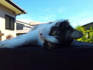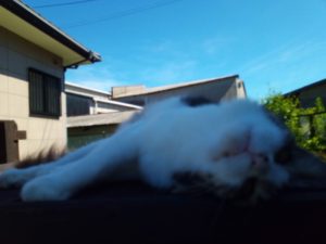 夏蜜柑についた蛹或いは卵?白くてサザエの蓋みたいな感じのものが、高さ2.3m位の処の葉裏についていたので、水で洗い流していたら、福が家の中から出て来ました。西隣さんの日陰にはトラ子もいてアレレ?うめも家の中から出て来ました。トラ子はナ~オ!『一人にして置いて呉れよ~!』