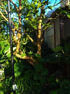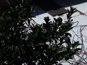 右: 後ろの白いのはお隣の物置の屋根です。シルエットになってしまいましたが、大きな実が2つ、やや小ぶりのものが一つ生っています。