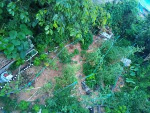 玄関アプローチのサツマイモには乾燥しきって吸血鬼が付いて居るので、ホースの水で弾き飛ばして、ふと反対側を見ると芍薬が葉を枯らし始めて居ました。後で、里芋の方へ移動しよう。