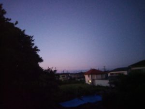 面白い事に東の光より月の光が残っている原っぱでは、オオヨシキリがいつもより早く囀り始めました。10分遅れて烏が東側で鳴いています。レンズが写し出す光と色は、肉眼とは異なります。写真では東の写真が一番明るく見えるのですが、実際には闇が薄っすら残っています。南は闇で、西南西の方角は原っぱの緑が薄っすら見えます。