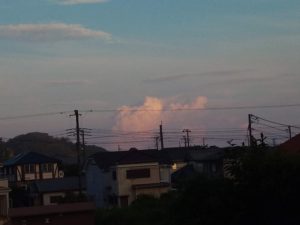 青い空に白い雲が沢山現れる台風前後の空は雲好きな人には堪らない魅力があります。この写真は雨を降らせると予想された雲ですが、どうやら本当に海際だけに雨を降らせた可能性があります。雲が来たら真っ暗になり、家路を急ぎましたが、降りませんでしたねぇ。北西からやって来た雲は、ドラマを予想させましたが、雨粒を落す事なく去って行きました。