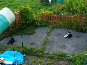 猫達の夕涼みが始まりました。少し先にうめも居ます。風が強いから表にも行けず、暑くて仕方がなかったよ、とでも話し合っているのでしょうか。