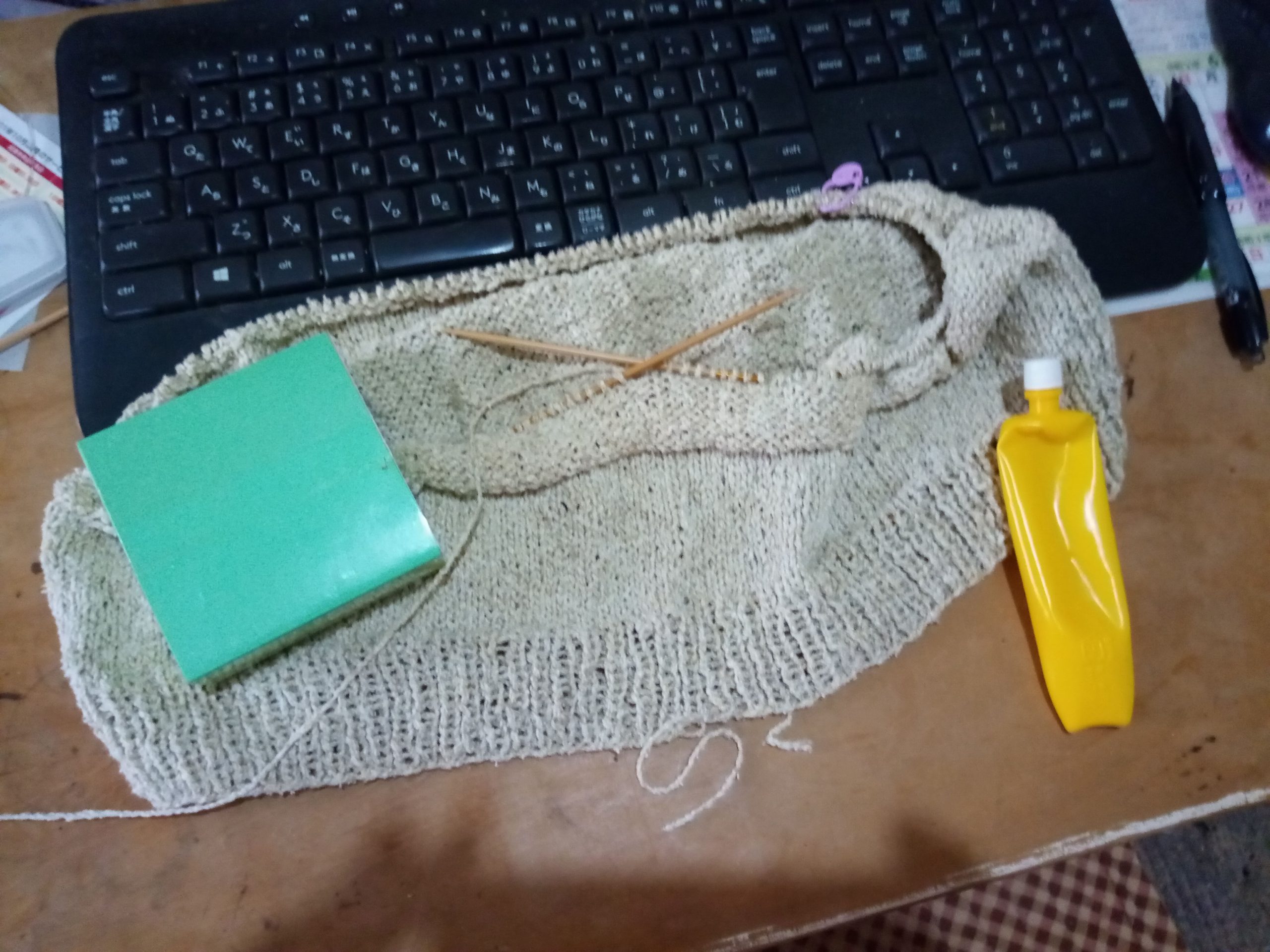 残り糸はピンポン玉より少し大きいくらいです。今日中には次の糸玉に行けそうです。そろそろ身頃に分けなくてはいけないですね。丈は編み始めから20㎝になりました。