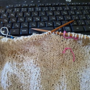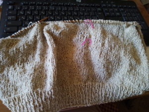 左: 昼寝を間に入れながら、裾から20㎝を越えました。25㎝まで編みます。あと3㎝位かな。段で言えば10段ですね。丈は前回編んでみて修正した点です。