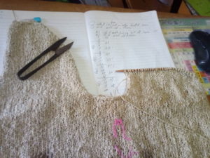 12時まで、汗をかきかき編み物をしました。後ろ身頃の減らし目が終わり、後は前身ごろと同じ長さになるまでストレートに編み続けます。