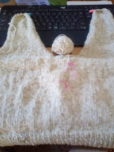 7時前、写真の処まで行きました。これから後ろ身頃です。糸は中心に置いたもの以外に二玉残っています。ギリギリかしらね。
