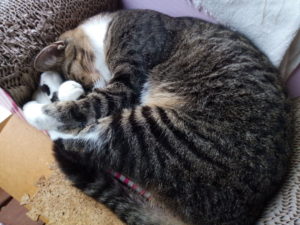 うめはシーバーデュオ入りのカリカリとたまの伝説の残りを食べて、また外出。その途中で、古いレジ袋を階段に落して遊ぶのを忘れません。小さい時からの遊びです。私がまた踊り場から二階に持ってきます。うめは結構大食猫ですが、一遍に食べる事は普段はしません。猫独特のチョコチョコ食べです。福は一遍に食べて、時に食べ過ぎてしまいます。トラ子は完全なマイペース。オシャシミだけは例外です。