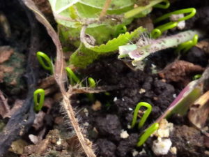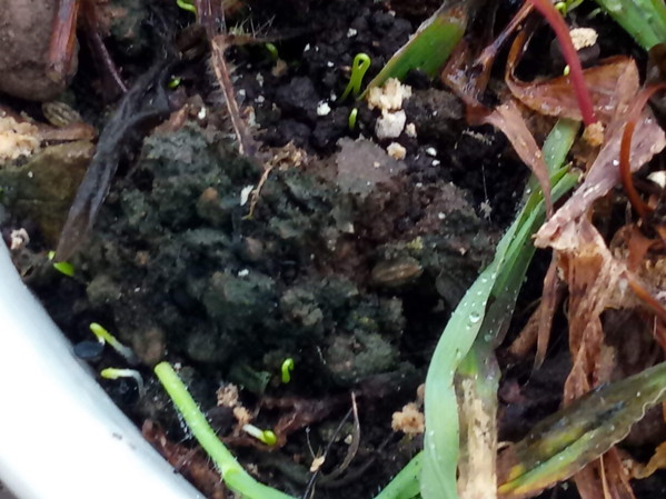 中: 玉葱の発芽です。昨日緑化させた茎が立って来ました。どんなになるのかなぁ!