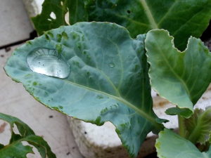右: 紋白さんのお子さん達にボロボロにされたキャベツたちの葉にクチクラ層が確りと出来、雨粒を抱えています。