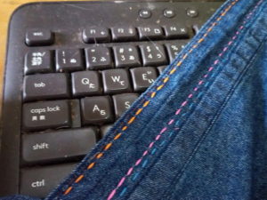 14時には襟の刺し糸は6本になりました。今日は此処まで…中毒だ~!ジーンズの脚の部分だけ、捨てようと思っていたけれど、ズボンの生地は活用出来るんですよね。それにこういう生地は市販されていないんですよ~、という事で解いて縫い合わせています。これも途中まで。