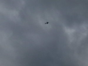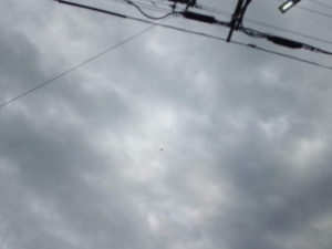 左: パソ塾に行くために歩いていたら東からP3Cが飛んで来ました。西に向かって珍しい航路だな、と思っていると高校の丘の上で緩やかに来たに転向して行きました。左の写真はかなり引き伸ばさないと分からないですね。中の写真は4.0倍にして見たので、正直フレームの中に入っているかどうかさえ自信がありませんでした。右: 住宅地の入り口にある韮の花が盛りを迎えつつあります。