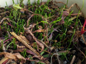 今朝の仕事は玄関前のチョキチョキです。ボカシを梅の樹の根元に撒いてから刈った草を積んで行きます。日光種苗さんに戴いたかすみ草の種と韮も物干しで播種して見ましょう。韮は庭に直接まくと消えてしまいます。鉢で発芽をさせて日当たりのよい西側玄関前においてみましょうか。それともかすみ草は直蒔きで行っても良いですね。今はゆあぱーくさんでも花の丁度無い時の様です。