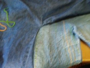 これがセット買いの作務衣のズボン(1年間酷使)と手を通さなかった上着の色の差です。販売元はベルーナとか言う処。ズボンの方は膝が抜けてよれよれですので、刺し子で補強です。