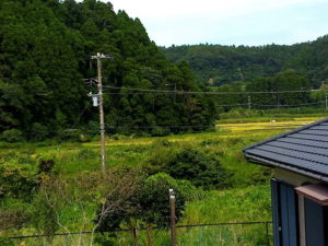 ハッキリ稲刈りの状況が玄関前でも見えたので、物干しから撮りました。