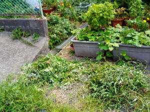 左: 左の山が普通の草;右の山がツユクサ等、雨に濡れて直ぐに発根してしまうもの。