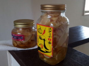 今朝漬けた生姜が瓶の肩まで下がっていましたので、中くらいの生姜を入れて、EMXゴールドと蜂蜜を少々足して、瓶を逆さにして空気に直接触れない様にしました。一週間位は目の届く処で時々瓶を逆さにして蜂蜜液に浸します。その後、冷暗所で3ヵ月位置いてから使います。予想したよりもエキスの出方が速いですね。