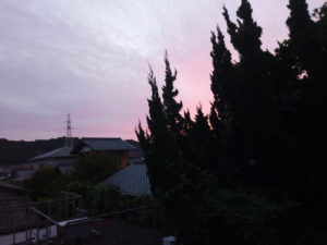 此処に座っているとお隣で朝の支度をする良い匂いが伝わって来ます。冬には石油ストーブの臭いも来ますが、今朝は目玉焼きの焼ける匂いでした。日曜日にはホットケーキの甘い匂いがしていました。