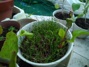 中: 極早生玉葱タイガージェットの苗です。少し太くなってきたかな?同じ鉢に生えているのは春蒔きビーツです。暑さが落ち着いて来たら、復活して来ました。