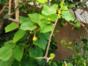 左: 夏蜜柑の樹に葛と一緒に上る胡瓜です。真ん中には雌花が見えます。