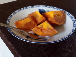 ゆあぱーくさんに出ていた柿を買いました。見るからに”庭先にある柿です”見たいな普通の柿で、西村柿と書いてあった様な氣がしました。黒ゴマびっしりの甘い柿です。私も柿の木が5-7本位ある家に育ったから,柿は小さい頃からの大好物です。