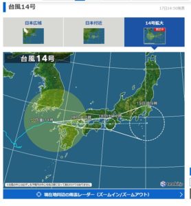 一番先に見たのが天気jpの台風14号チャンス―の進路予想図です。あれっ!?随分南へ向いている。佐賀県・福岡県は直撃、瀬戸内海を進んで和歌山県北部―大阪府南部、三重県から大平洋上に抜け、伊豆半島沖から更に南東へ進む…。