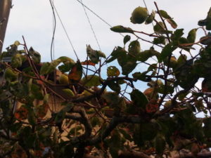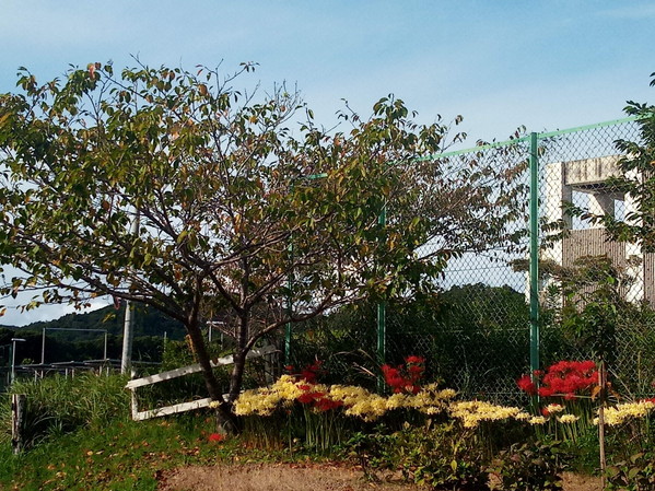 中: 大きな盆栽風に育てられた柿の木には実がたわわになっています。