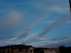 昨日から風はやはり普通じゃない。強い訳じゃないけれど、妙にエネルギーを感じる時があります。空には低層でも筋雲の様に、筋雲みたいな引く雲が出て、上の方は風が強いのだろうなぁ、と思わせます。日本画に出て来そうな雲もあれば、フワフワした雲もありました。