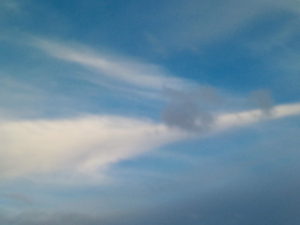 左: 東北東に現れた白く輝く雲。中: 浅間様の上に出たクジラみたいな胸鰭が印象的な雲。鯱動画を見過ぎたのかなぁ。右: これは多分北側の雲です。