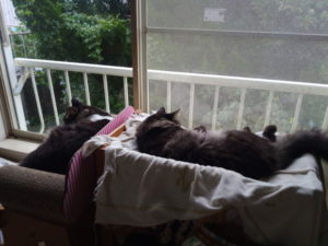 食後の恒例のお昼寝から起きたら、トラ子が帰って福も帰って来ました。その後で、バケツをひっくり返したような雨が2-3分続き、ピタッと止みました。