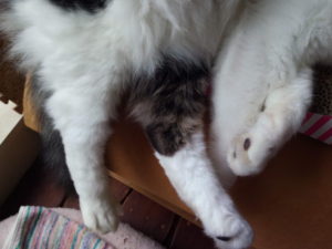 2歳になったばかりのうめだけがはしゃいでいます。子供だねぇ。昨夜は21時頃からタイガーさんも来て寝ていました。外から帰って来た福をうめが追いかけ、お尻を猫パンチされています。
