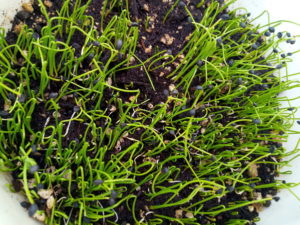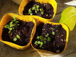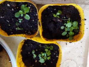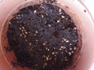 分割して鉢増しをしたビオラ苗と大葉韮を播種した鉢を物干しに出しました。ボカシを物干しの苗に上げて置きましょう。表面に置くだけです。後で日光を浴びられる時間にはもう少し気温が上がるでしょうから水遣りをします。