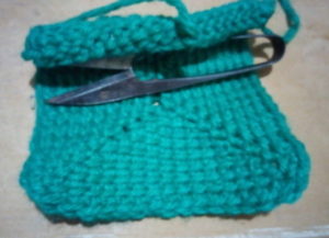 左側から手前に向かって編んで来て、減らし目をして45度の角度…実際には次の工程が出来るまでは75度位に見える…次に増し目をして10目になったら減らし目をして、増し目をして10目で左側の目を拾いながら編んで行くのです。