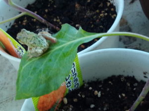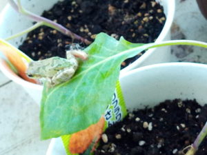 物干しのキャベツ苗の葉に乗せて、蛙を追いかけて福が出られない様に網戸の手前に硝子戸を10㎝ばかり開けて置きました。これで夏蜜柑の樹に帰って呉れるかな。小さいですが、少し模様がある蛙です。トノサマガエルの幼体かな?蛙はきっと大きな口で何でも食べるんでしょうね。大きな蛾の蛹を咥えて食べている写真が無料動画サイトに出ていました。生きている虫も食べるでしょうし、意識して見ていないけれど、草原と化した我が庭では大活躍ですね。小鳥も来て呉れるし、色々な動物に助けられています。