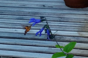 左: 蜂みたいな蛾がサルビアの蜜を吸いに来ていました。中: 韮には確りと種が出来て来ました。