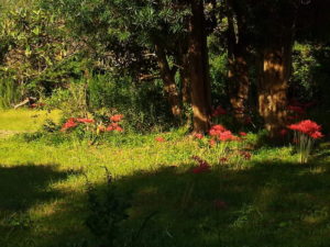 左: 畑の傍の杉の木立の足元には彼岸花。