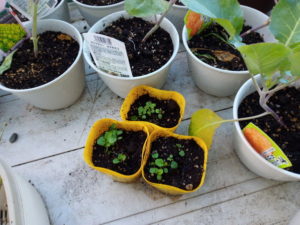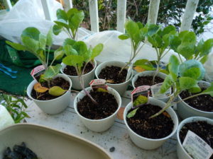 左: ブロッコリーたちが横座りをするようになって来ました。そろそろ植えてやらないと…茎から不定根を出して確りしたいのでしょう。ブロッコリ-の仲間ってどうかすると60㎝近く、地面を横座りの様な形で場所をとるのですよね。