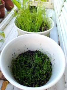 右: 手前が中晩生玉葱ノンクーラー(9月13日蒔き);向うが極早生玉葱タイガージェット(8月31日蒔き)です。