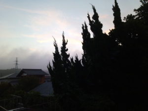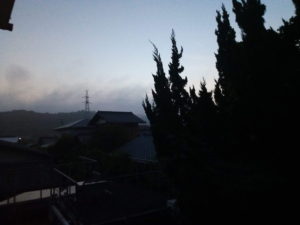 5時6分、東北東の山の上は雨雲?海へ向かって流れて居ます。右: 物干しから見た南東、メキシコ塔の方面です。かなりもやっています。田圃の方は靄って居ません。