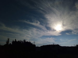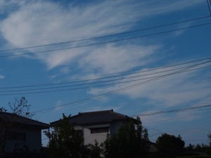 中: 東はカイヅカイブキの向う、つまり真東から南へかけて雲が穏やかに光っていました。